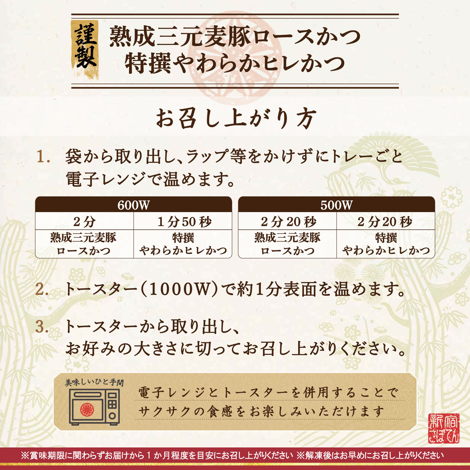 ロースかつ・ヒレかつは電子レンジ、かつサンドは自然解凍でお召し上がりいただけます。