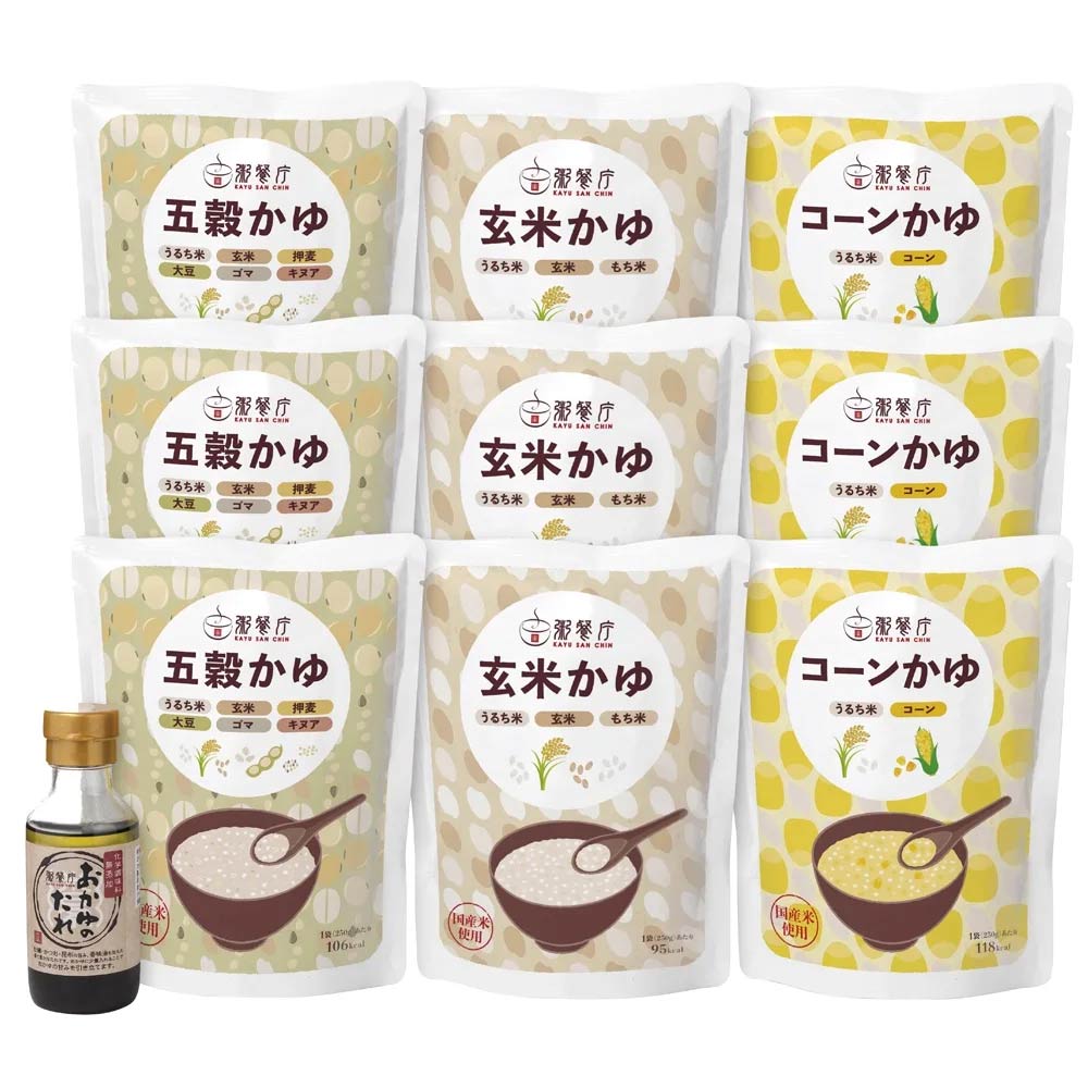 五穀かゆ250g×3パック、玄米かゆ250g×3パック、コーンかゆ250g×3パック、おかゆのたれ105g×1本