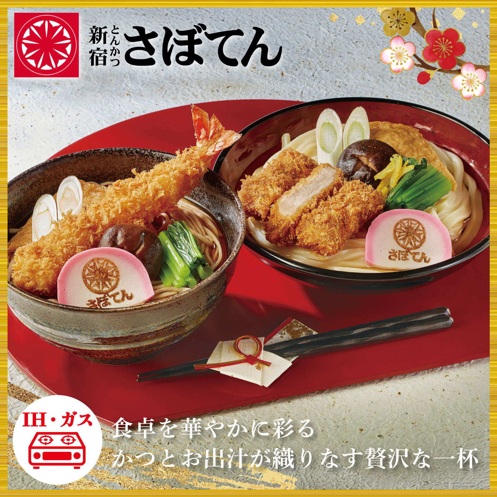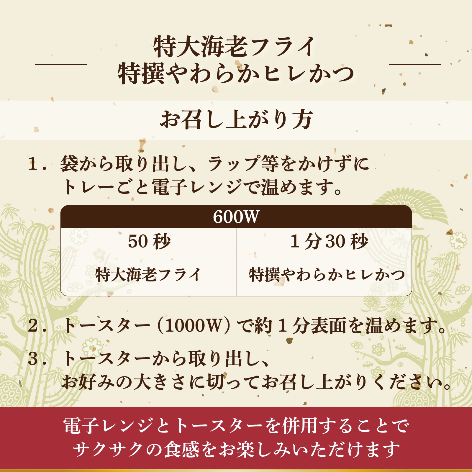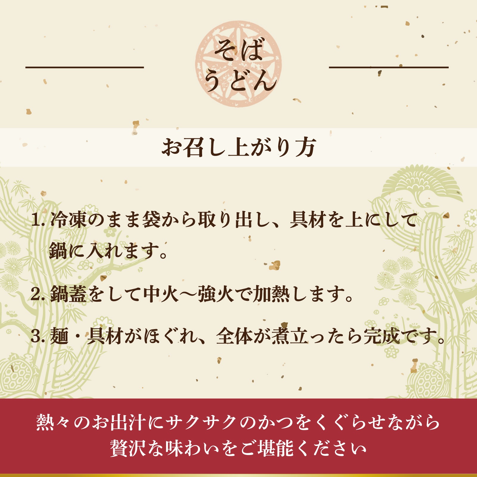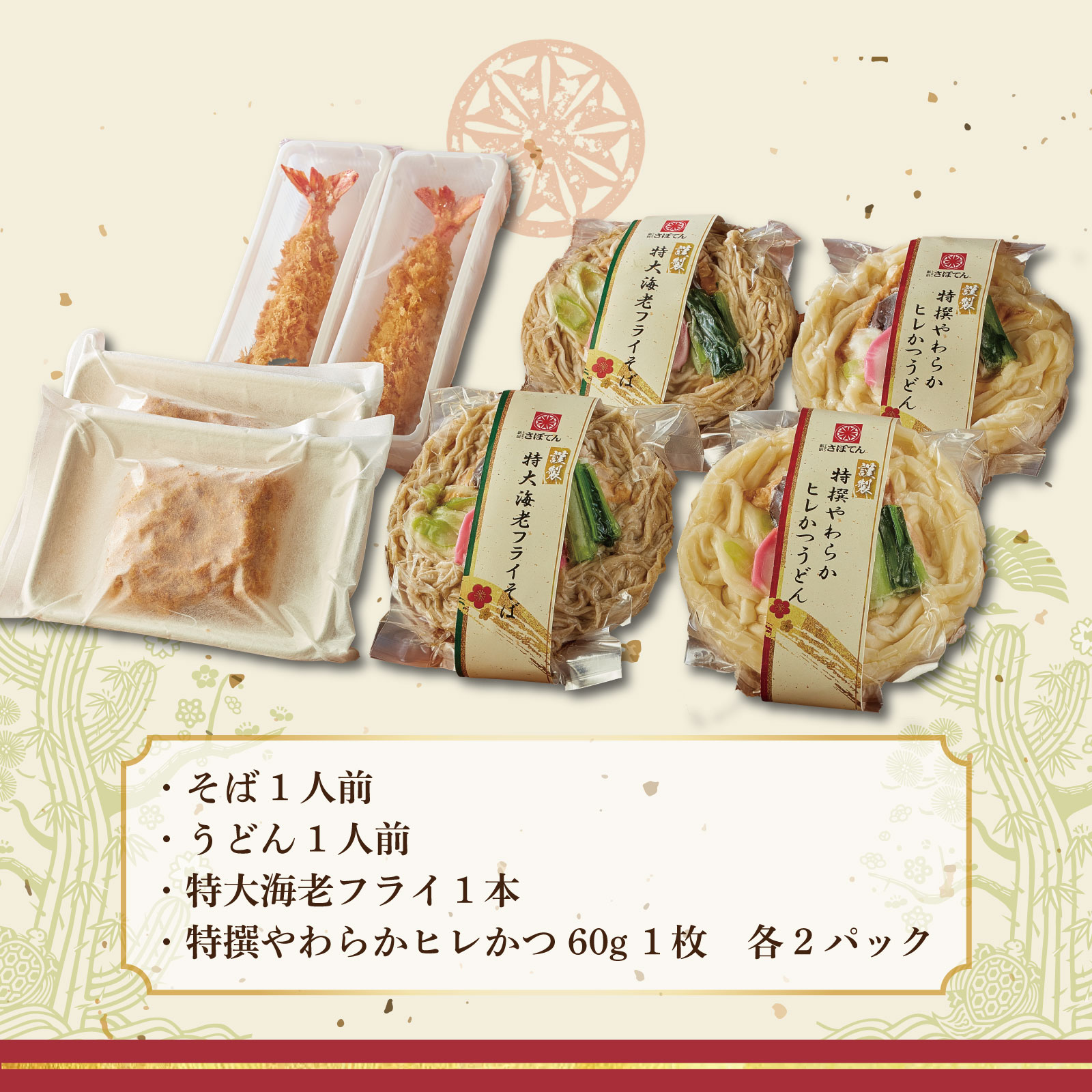 そば1人前×2パック、うどん1人前×2パック、特大海老フライ1本×2パック、特撰やわらかヒレかつハーフ1枚×2パック