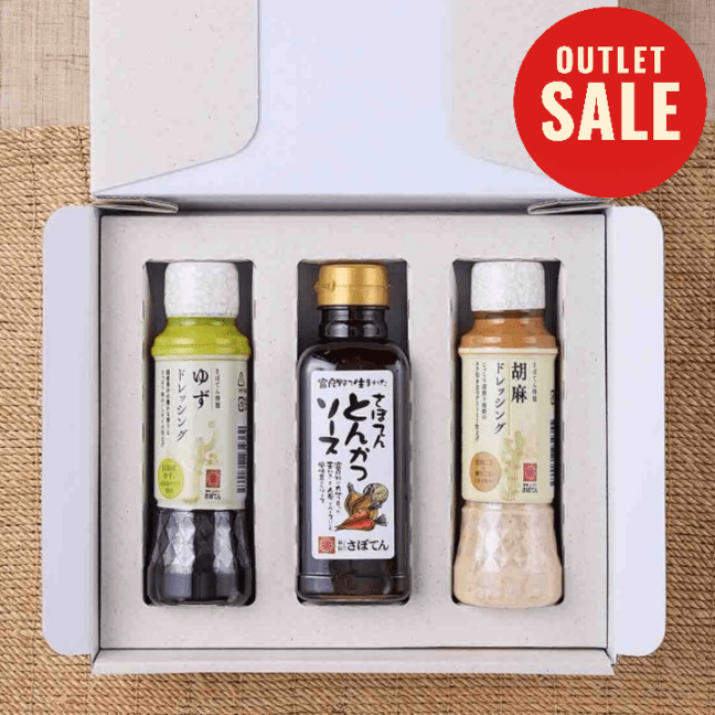 「さぼてん」オリジナルの胡麻ドレッシングとゆずドレッシング、オリジナルとんかつソースのセットです。