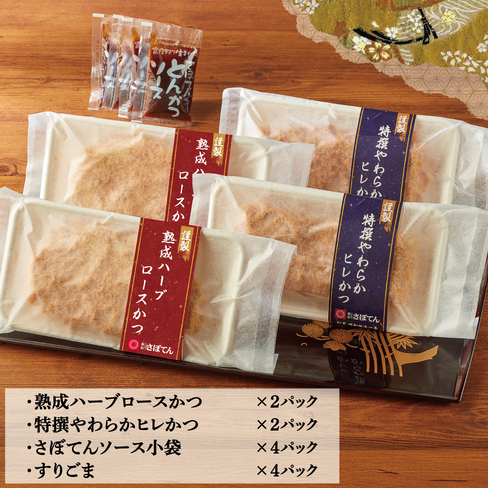 熟成ハーブロースかつ1枚×2パック、特撰やわらかヒレかつ1枚×2パック、小袋ソース25g×4パック、すりごま2g×4パック